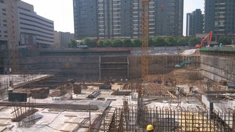 本工程位于北人字路與龍王廟街交口的東北角。是在原北國商城西側(cè)進(jìn)行擴(kuò)建工程,地上10層、地下4層、采用筏板基礎(chǔ)、框架結(jié)構(gòu)。工程±0.000為72.500m,基底標(biāo)高為-19.900m。現(xiàn)有地面標(biāo)高為-0.400m。基坑實(shí)際開挖深度由現(xiàn)有地面算起為19.50m(南側(cè)、西側(cè)、北側(cè))、12.00m(東側(cè):原北國商城)。整個基坑周長約400.00m。