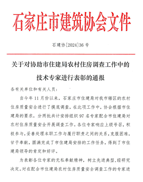 2024年11月,石家莊市住建局對(duì)市轄區(qū)農(nóng)村住房質(zhì)量安全進(jìn)行了摸底調(diào)查,中繹集團(tuán)響應(yīng)上級(jí)號(hào)召,派出多位技術(shù)專家積極參與,配合市住建局的調(diào)查工作,得到石家莊市住房和城鄉(xiāng)建設(shè)局、石家莊市建筑協(xié)會(huì)好評(píng),近日受到石家莊市建筑協(xié)會(huì)表彰。