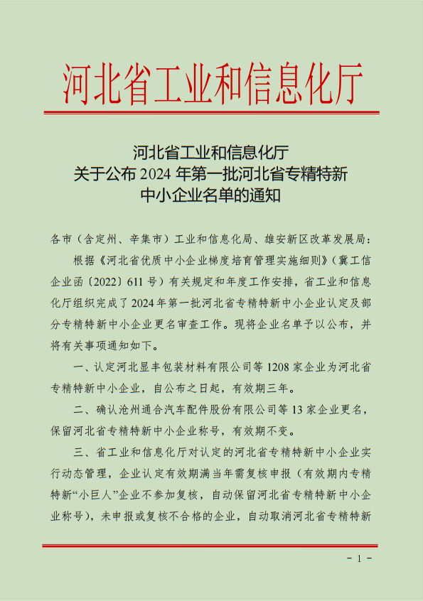 近日,中繹集團榮獲河北省工業和信息化廳授予的“河北省專精特新中小企業”榮譽稱號。